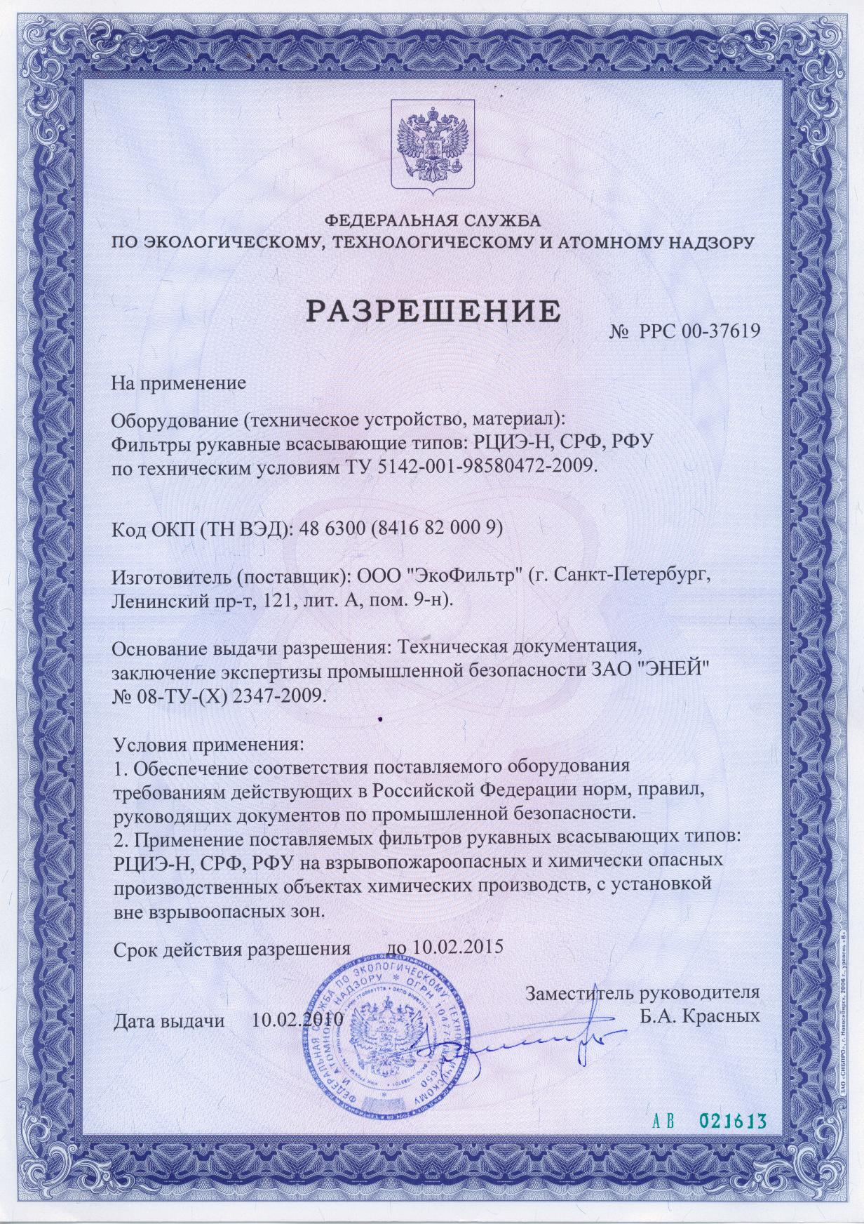 Разрешение Федеральной службы по экологическому, технологическому и атомному надзору на применение рукавных фильтров РЦИЭ-Н, СРФ, РФУ на взрывопожароопасных и химически опасных производственных объектах